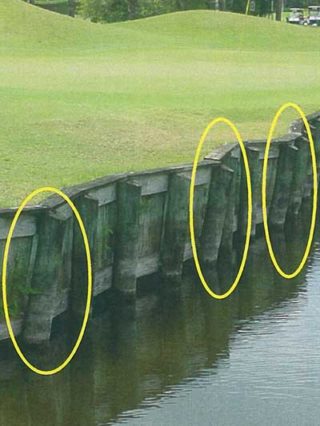 The wooden walls all have minimal preservative treatment as they are not as essential in freshwater lakes as they are in harsh saltwater environments. Heavier chemical treatments are required for service in warm saltwater environments where marine organisms and teredo worms (water- borne termites) exist that cause piling decay. The life expectancy of a wood golf course wall is typically less than 25 years.