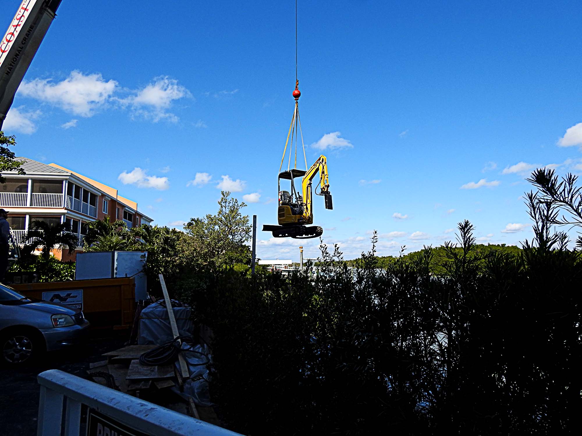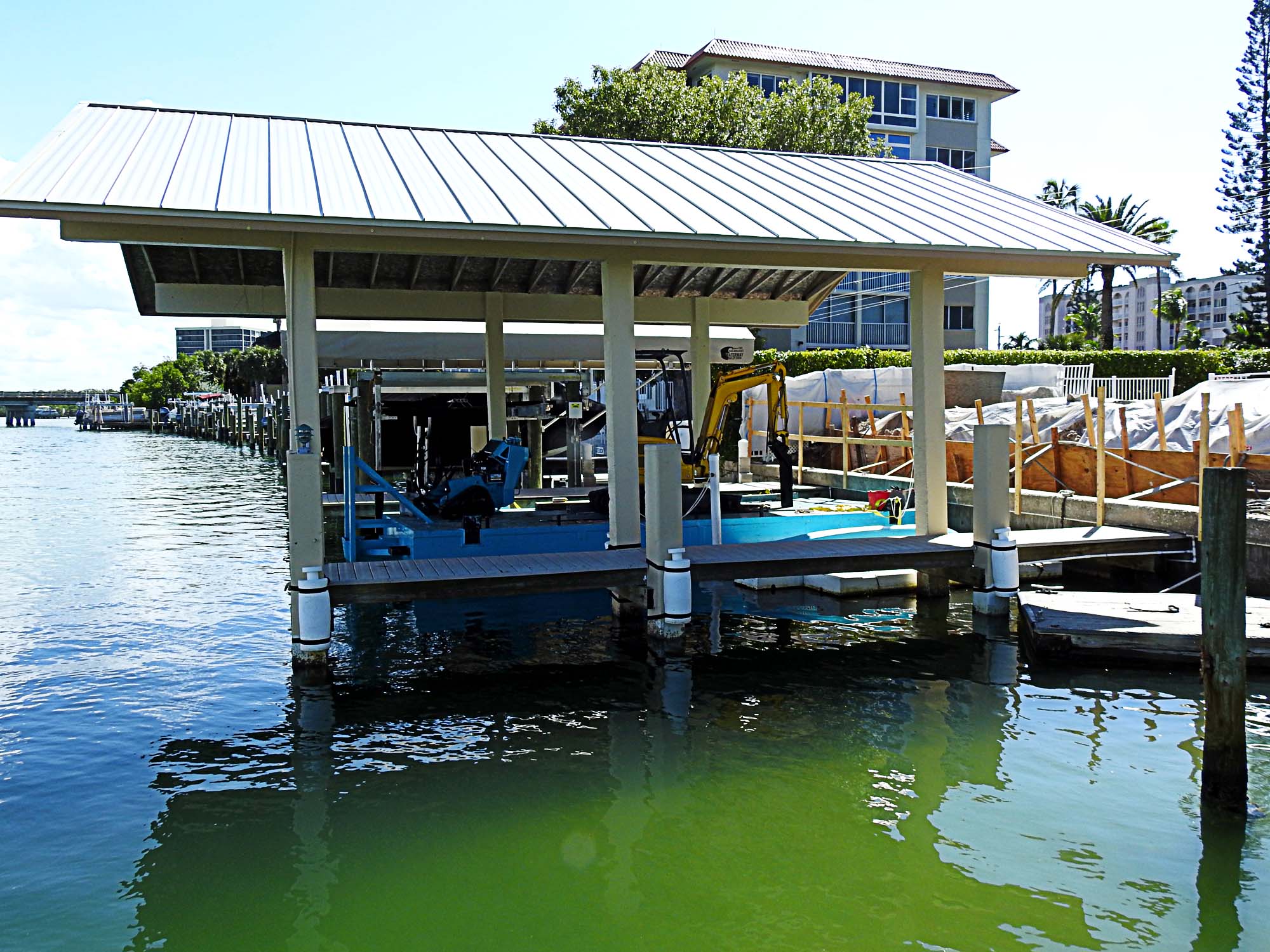 Coastal Foundation Solutions had to deploy our specialty equipment to proceed with this stabilization project. We launched our 26-foot aluminum barge from the condominium parking lot into Big Hickory Pass with a 75-ton crane. Next, our Kobelco mini-excavator was flown unto the barge to facilitate installation of helical compression piles and helical tie-back anchors.
