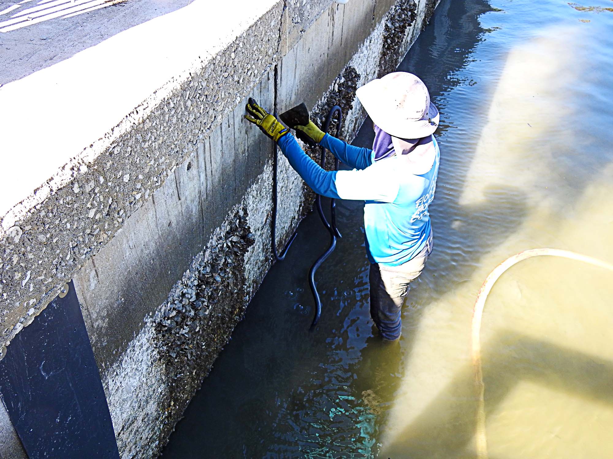 Coastal Foundation Solutions was also tasked with eliminating soil migration through the existing seawall seams. This methodology entailed scrapping the marine organisms off the concrete seawall and seams. We then installed a backer rod that has a closed cell exterior into the seams which is permeable to allow water to escape but contain soil properties. A ¼” P.V.C. panel was the attached to the wall and fastened with ¼” 316 Stainless Steel anchors.