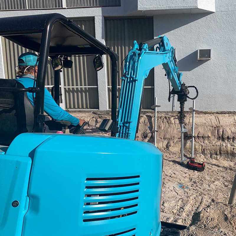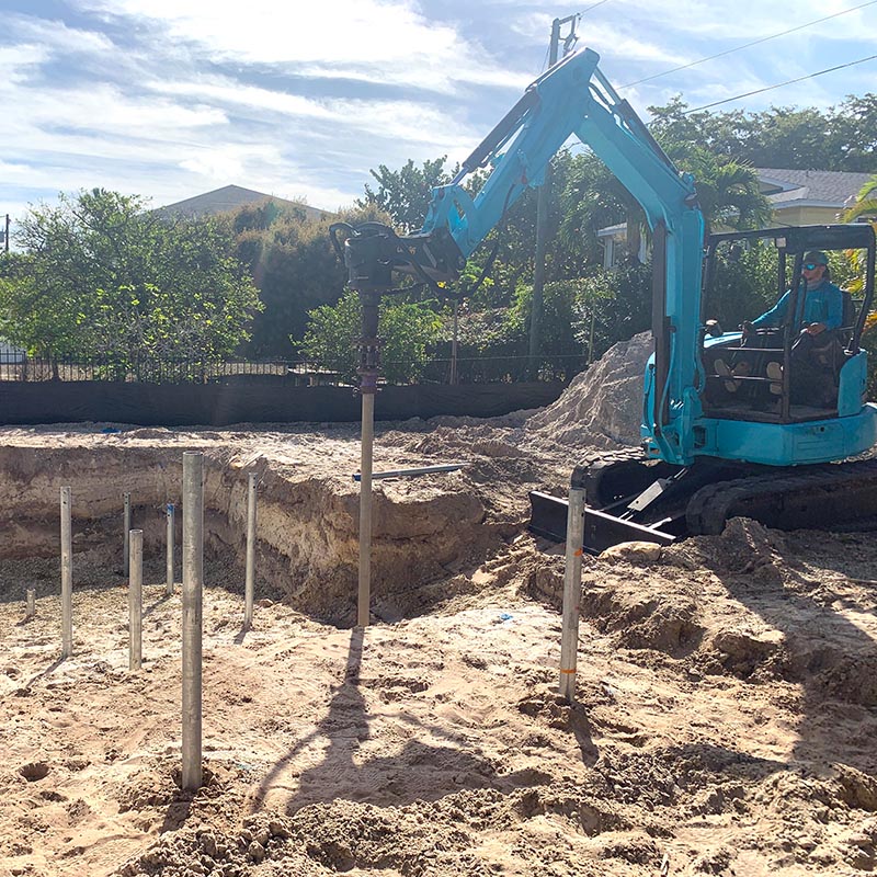 Using specialized equipment, our team went to work on Fort Myers Beach installing fourteen (14) helical piles to a depth of 14 foot, yielding a compression capacity of 24 tons. Once all helicals were driven into the ground, galvanized termination caps were installed to complete the project. With minimal disruption to the job site, pool contractors such as Spiro can rest assured that neighboring homes will not be affected or inconvenienced by the installation of helical piles.