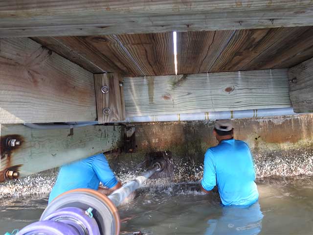 Coastal Foundation Solutions proposed solution proceeded precisely according to strategy with no negative consequences. We successfully installed a total of twenty-two (22) 1 ½ in. dia. helical piles, with an average pile length of 17 to 35 foot. The submerged helical pile installation process took a total of 7 working days, with on-and-off work periods performed in phases. (principally due to tide constraints) Turrell Hall and Associates effectively supervised the entire structural installation process, and managed all the inspections flawlessly. The piling loads included 14 kips (allowable) and each individual helical anchor was load tested.