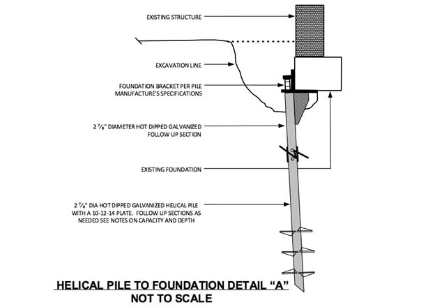 He prescribed helical piling to be utilized in an underpinning configuration to alleviate further settlement. Also, several helical tie-back anchors would require installation to stabilize the retaining wall.